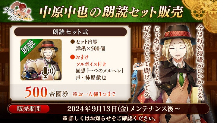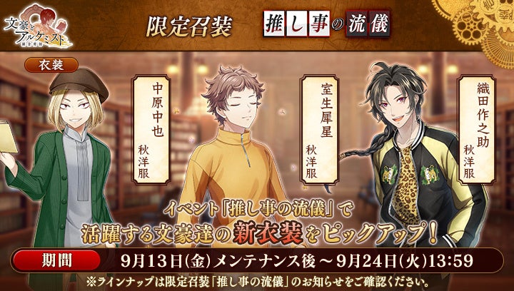 さらに、イベントと同時に開催される限定召装『推し事の流儀』にて新規追加された「室生犀星」「織田作之助」「中原中也」の〈秋洋服〉を編成すると、得点の獲得率がそれぞれ30%上昇します。