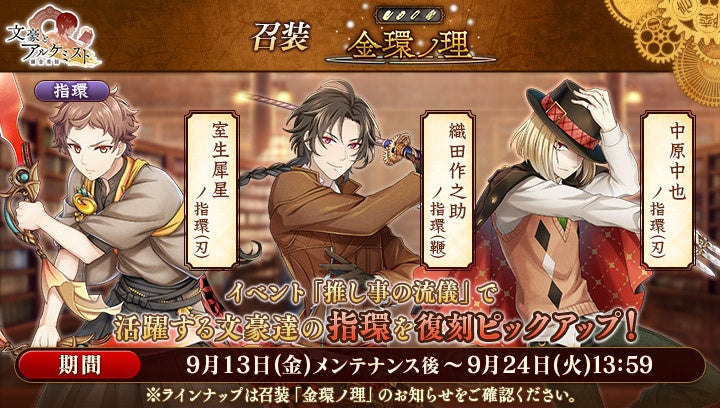 召装『金環ノ理』のラインナップを更新いたしました。この召装では、イベント『調査任務「推し事の流儀」』で活躍する「室生犀星」「織田作之助」「中原中也」の指環を一定の確率で入手できます。