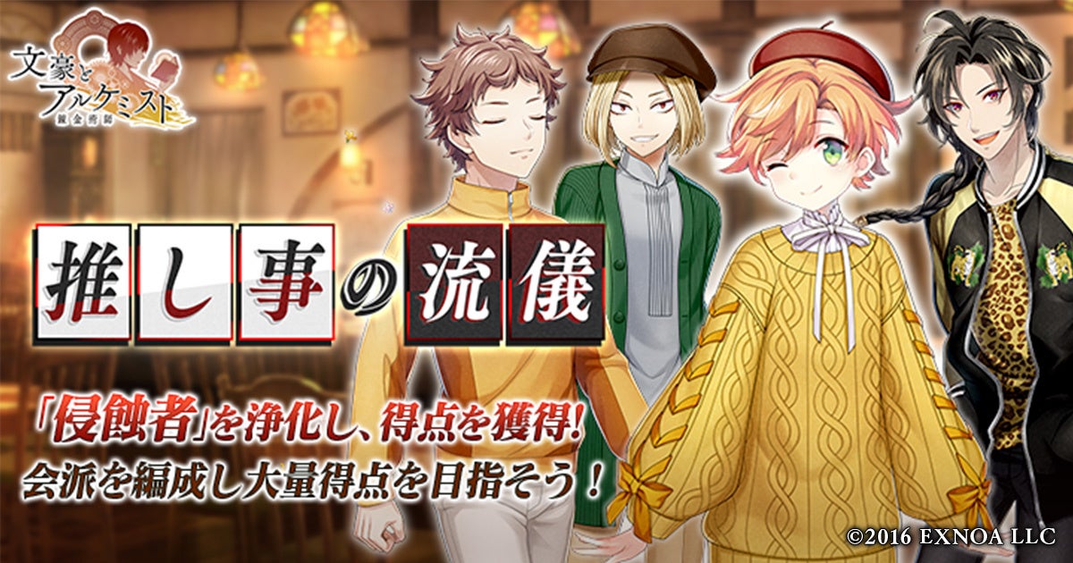 合同会社EXNOA(本社:東京都港区、CEO:村中 悠介、URL:https://games.dmm.com/)が運営するDMM GAMESは、9月13日(金)より、女性向け文豪転生シミュレーションゲーム「文豪とアルケミスト」において、イベント『調査任務「推し事の流儀」』と限定召装『推し事の流儀』を開始いたしました。