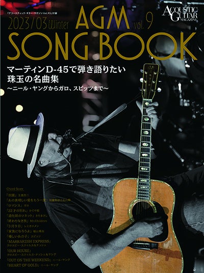 付録の歌本『AGM SONG BOOK Vol.9』には、D-45アーティストによる楽曲を13曲収録。ニール・ヤングからガロ、玉置浩二、スピッツ、Mr.Childrenなどの名曲のコード譜をダイアグラム付きで掲載しています。