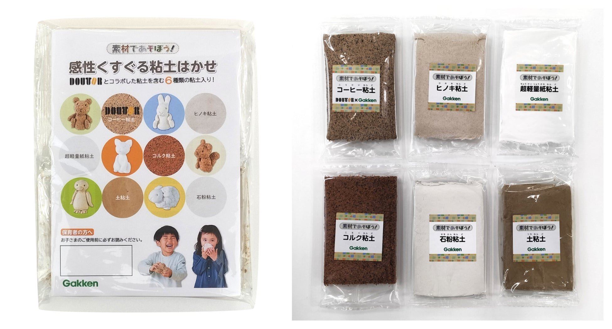 このコーヒー粘土に加え、ヒノキ粘土・超軽量紙粘土・コルク粘土・土粘土・石粉粘土といった、主に、リサイクルや地球環境にやさしい素材、自然由来の素材などを基に作られた粘土をセットにした商品が「素材で遊ぼう!感性くすぐる粘土はかせ」です。全国の園向けに販売していましたが、この度、一般のご家庭でも遊べるパッケージにし、「学研ステイフル公式オンラインショップ」限定で発売いたしました。