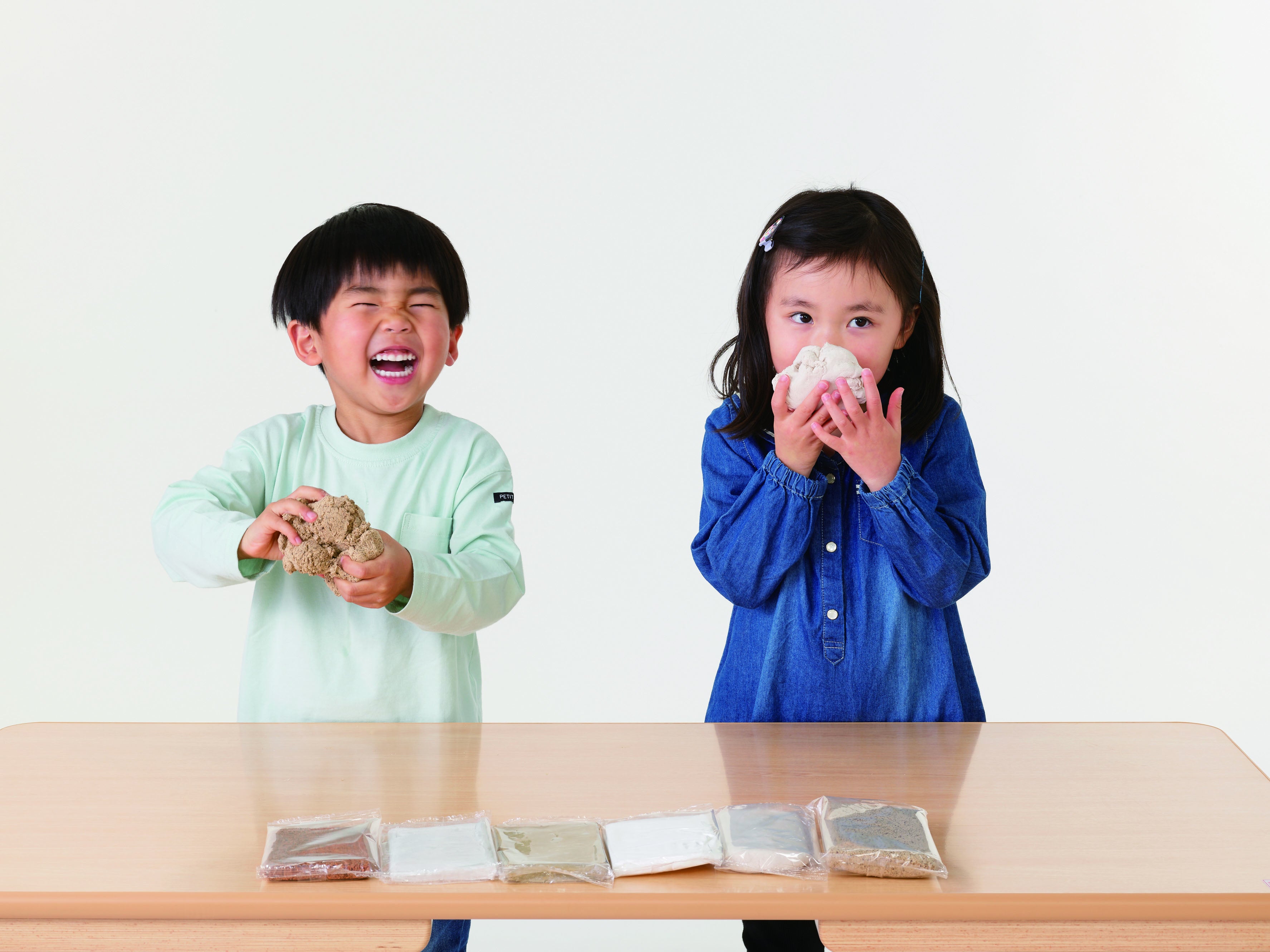 6種の粘土がそれぞれ異なる重さや質感、香りをもっています。子どもが楽しく粘土遊びをする中で、幼児の成長過程で培われる嗅覚や触覚などの感覚機能を刺激します。