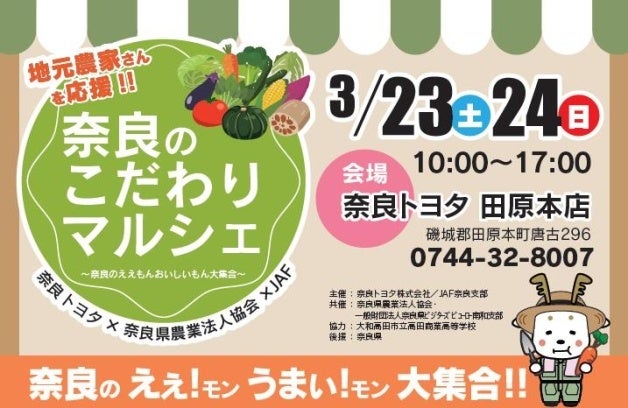 奈良には魅力いっぱいの農産物がたくさんあります。より多くのみなさんに知ってもらうため「奈良の農家さんを応援!奈良のこだわりマルシェ~奈良のええもんおいしいもん大集合~奈良トヨタ×奈良県農業法人協会×JAF」を開催します。