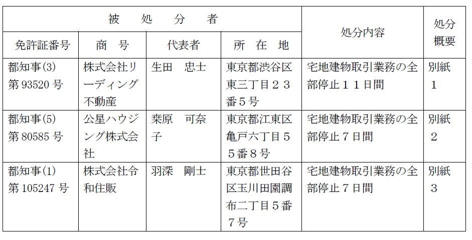 このたび、次のとおり宅地建物取引業法に基づく行政処分をしたので、お知らせします。