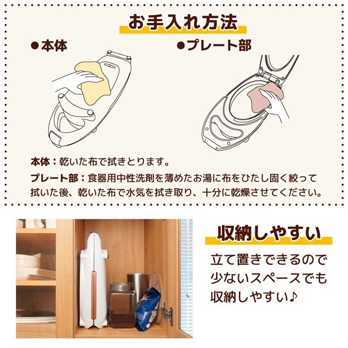 また、ヒーター部分は型になっているので包むのが難しいとんぺい焼きや、形成の難しいハッシュポテトなどの調理にも適しています。