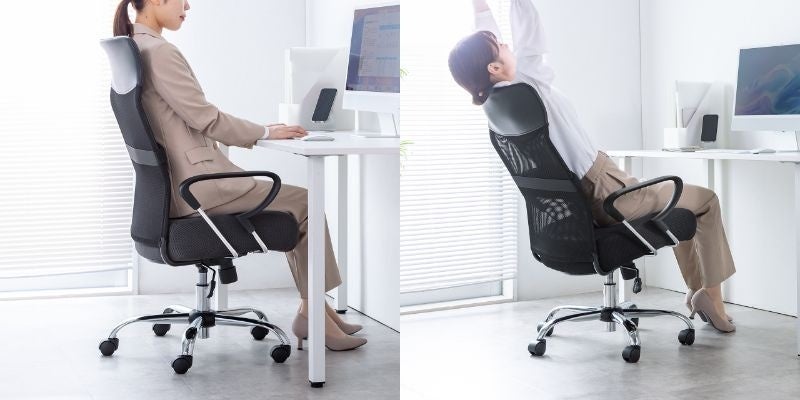 背もたれと座面が連動するロッキング機能を採用しており、机上での作業時にはまっすぐ、PC作業時には背もたれにゆったりともたれて入力ができます。