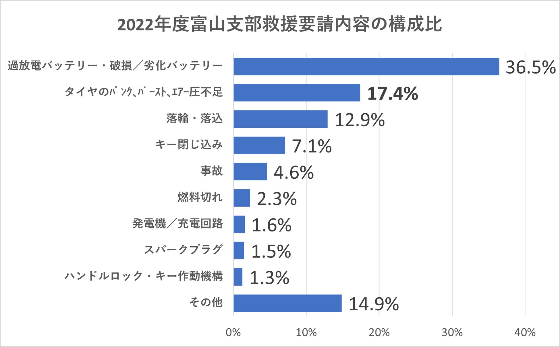 JAF(一般社団法人日本自動車連盟)富山支部(支部長 笹山泰治)は、タイヤ関連のトラブルが増加していることから、富山県内のドライバーに対して注意喚起を促すため、実施したロードサービスの結果に基づいて救援要請内容の構成比を公開します。