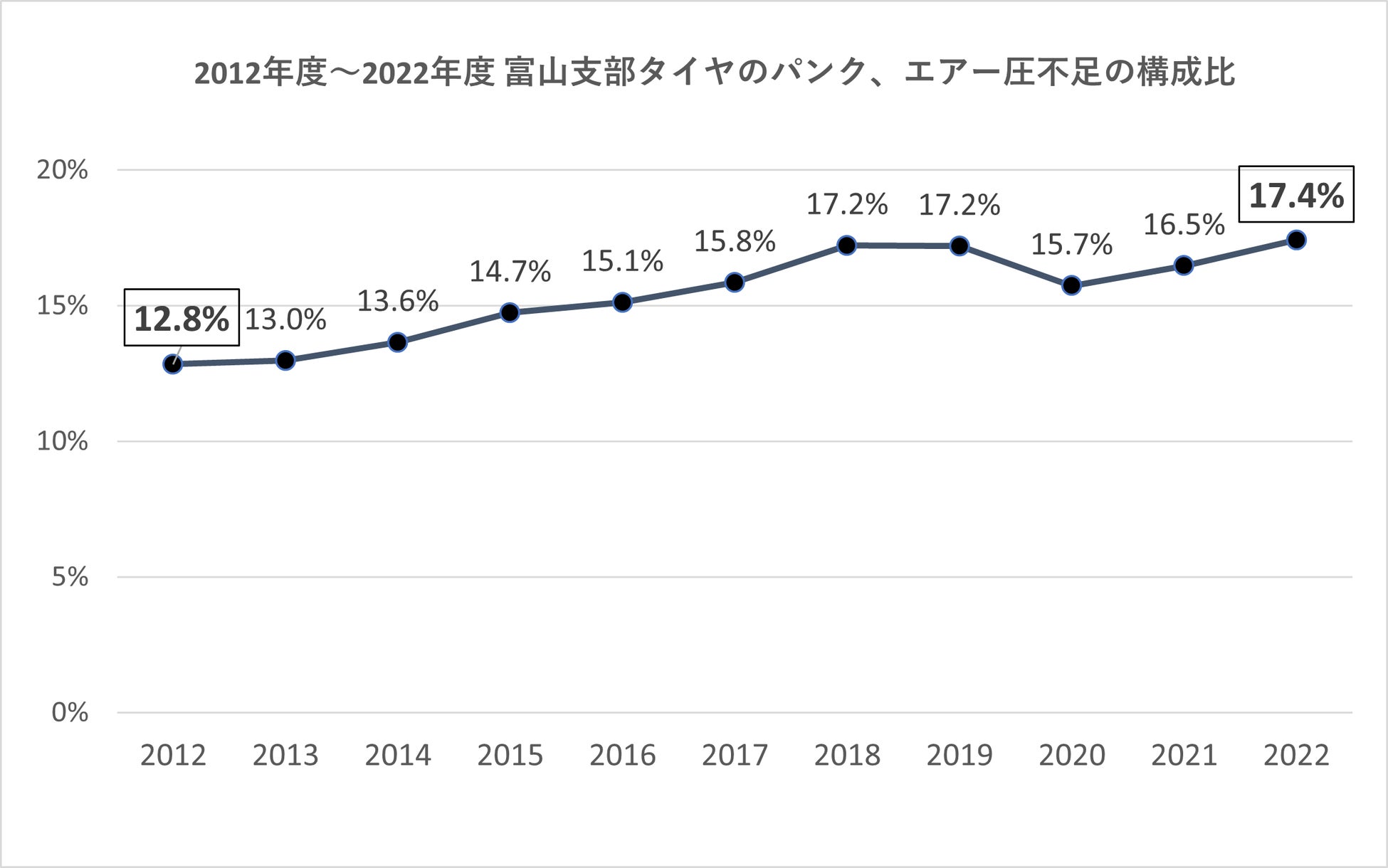 当支部が2022年度(2022年4月1日~2023年3月31日)に実施したロードサービスの結果から、タイヤ関連のトラブル(タイヤのパンクやバースト、エアー圧不足)の割合が高くなっていることが分かりました。また、2012年度(2012年4月1日~2013年3月31日)の割合は12.8%でしたが、2022年度には17.4%と増加し過去最高となりました。2023年度(2023年4月~2024年2月29日)においても2月時点で18.6%と増加傾向にあります。
