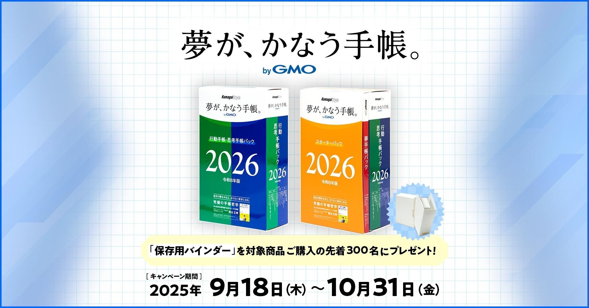 ”すべての人にインターネット”をコーポレートキャッチに、インターネットインフラ、インターネットセキュリティ、広告、メディア、金融、暗号資産事業を展開するGMOインターネットグループ株式会社(代表取締役グループ代表:熊谷 正寿 以下、GMOインターネットグループ)は、2025年9月18日(木)より、「夢が、かなう手帳。 byGMO」2026年版を、オリジナル手帳の販売公式サイト「クマガイ☆スタイルSHOP」(URL:https://shop.kumagai.com/)において販売開始いたしました。