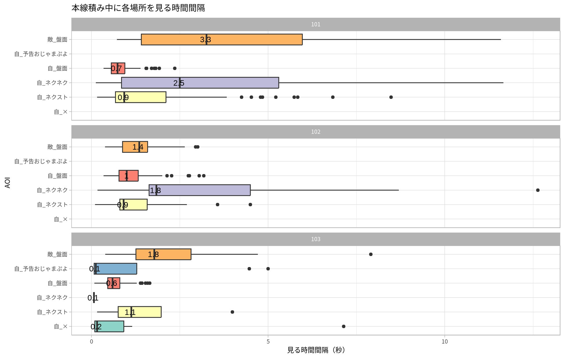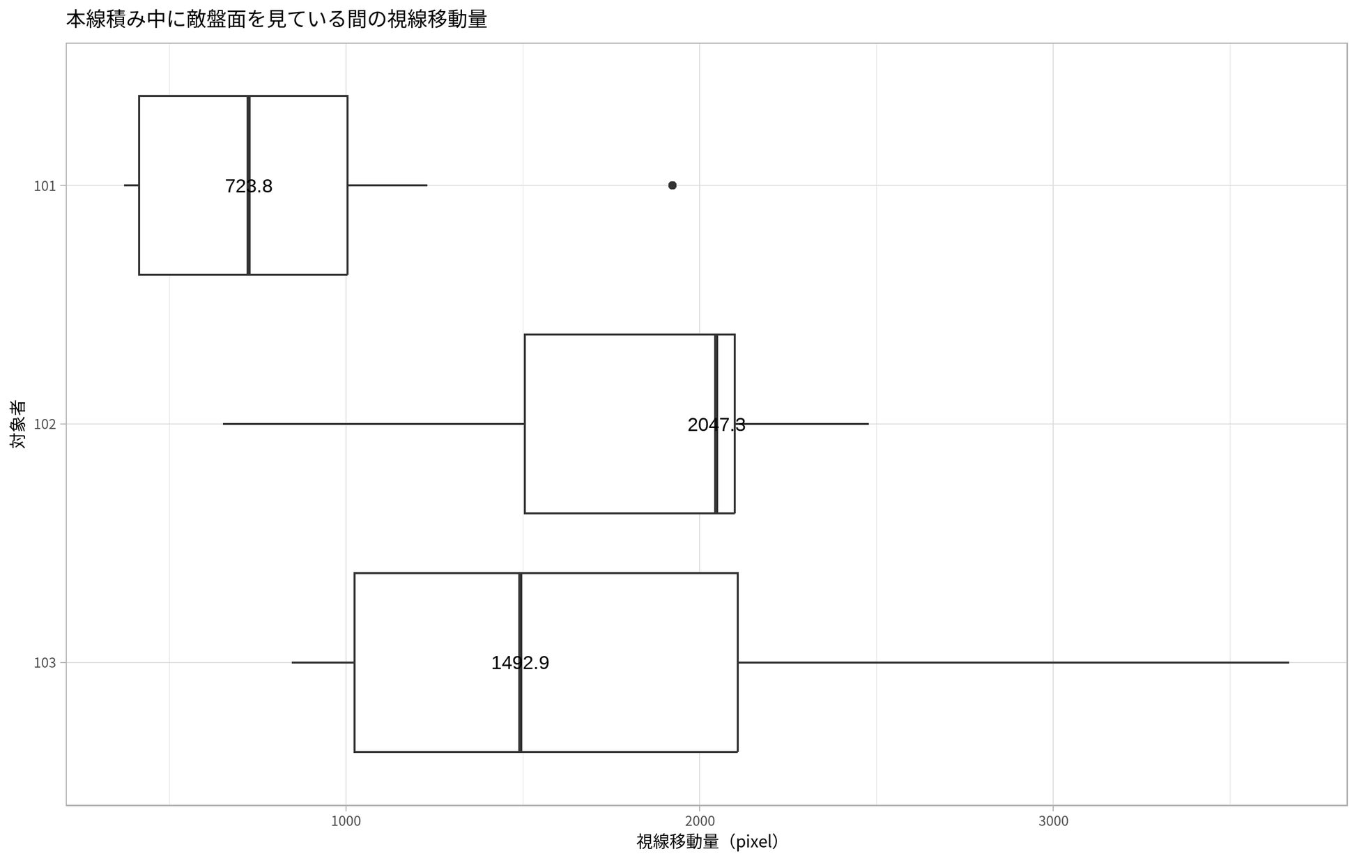 プレイヤー101(アマチュア)と比べると、プロである102、103とも視線移動量が多い。