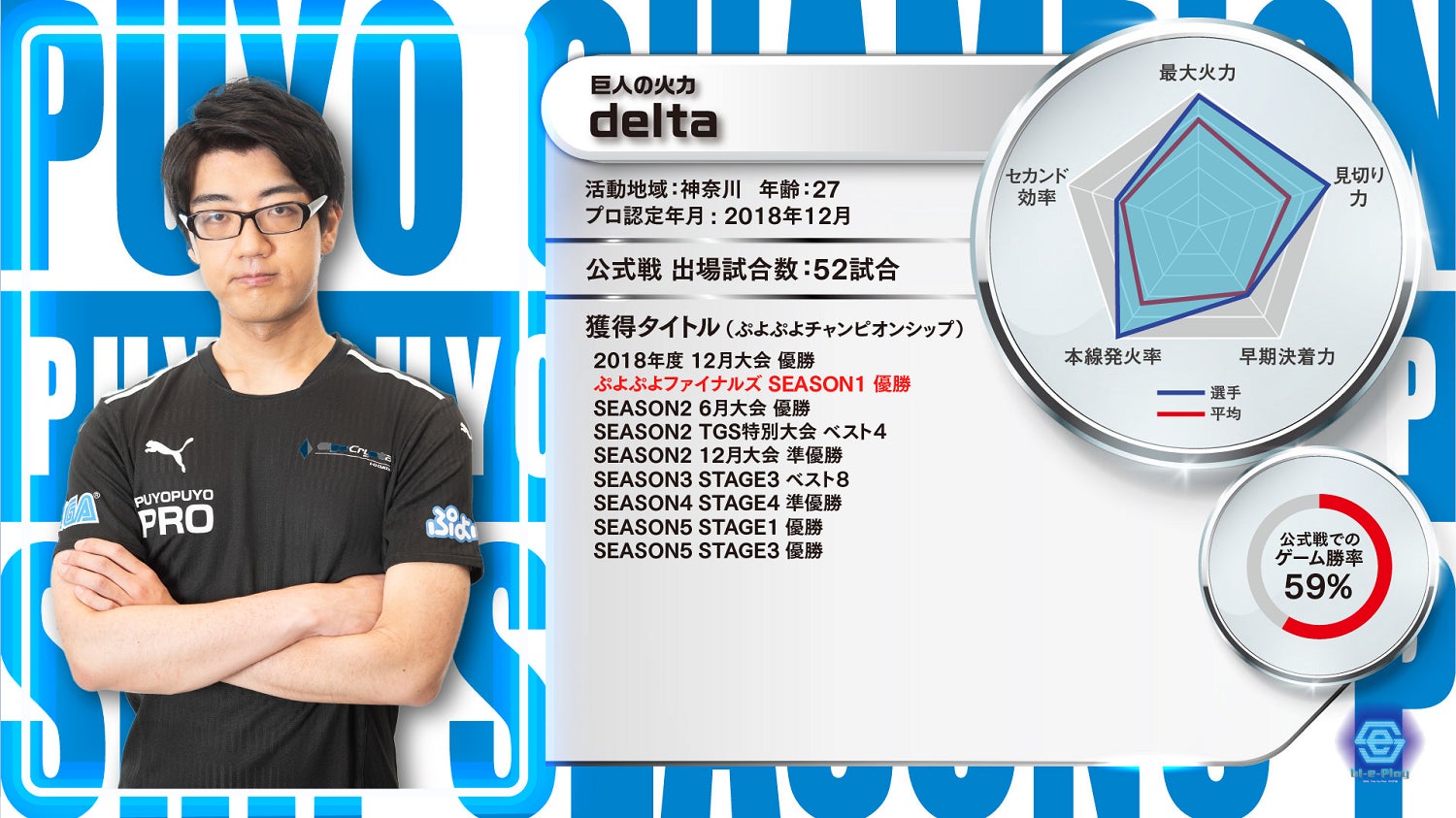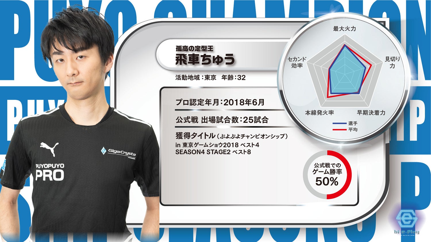『ぷよぷよeスポーツ』では、フィジカルスポーツと同様にeスポーツでも競技にはデータを活用した分析が重要であり、観戦をさらに楽しめるという点から、2018年よりAIによる画像認識機能を利用し、プレイヤースタッツの収集・分析・指標の算出を行う大会実況システム「bi-e-Play(バイプレイ)」を採用し、300試合以上をデータ化しています。そのデータを野球やサッカーなどのデータ分析を長年行ってきた、スポーツデータ解析の第一人者であり、「ぷよぷよ」プレイヤーでもある中央大学 理工学部数学科 酒折文武准教授が統計的側面から分析。そこにプロ選手の視点を加え、5つの指標でスタッツを作成し、大会のライブ配信でも観戦者から好評をいただいております。