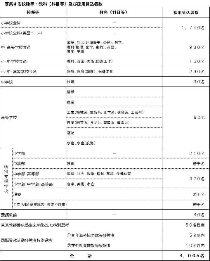 ※ キャリア採用選考の主任教諭の採用見込者数(20名以内)は、上記表の採用見込者数に含む。