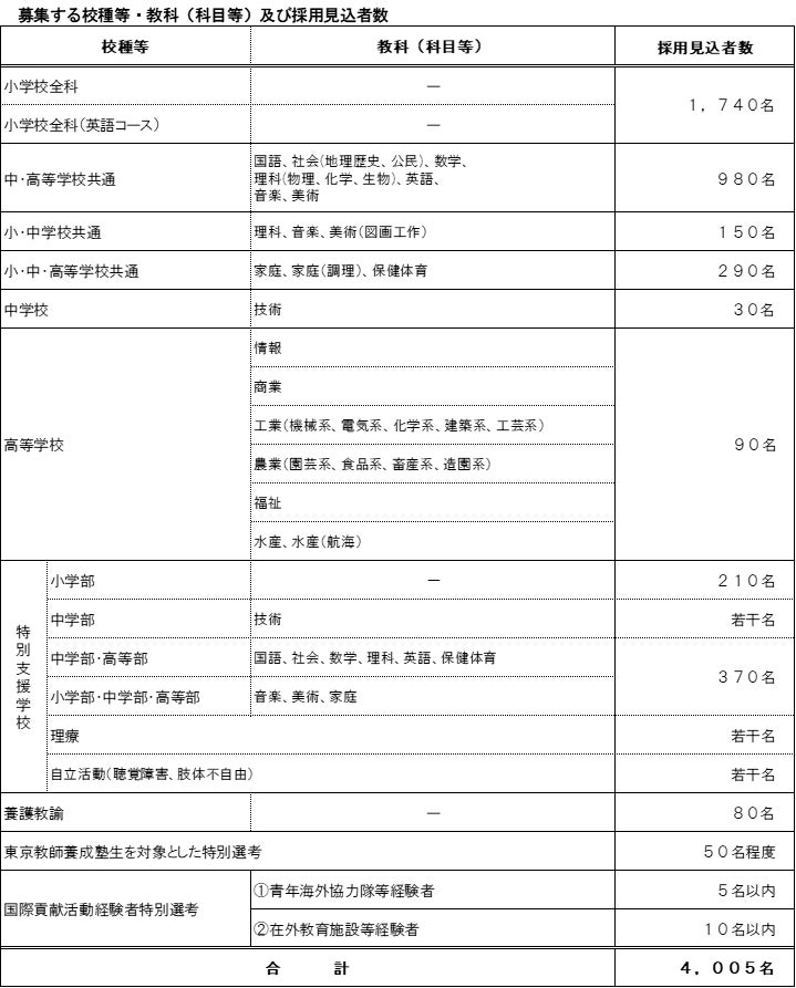 募集する校種等・教科(科目等)及び採用見込者数の詳細は、裏面のとおりです。