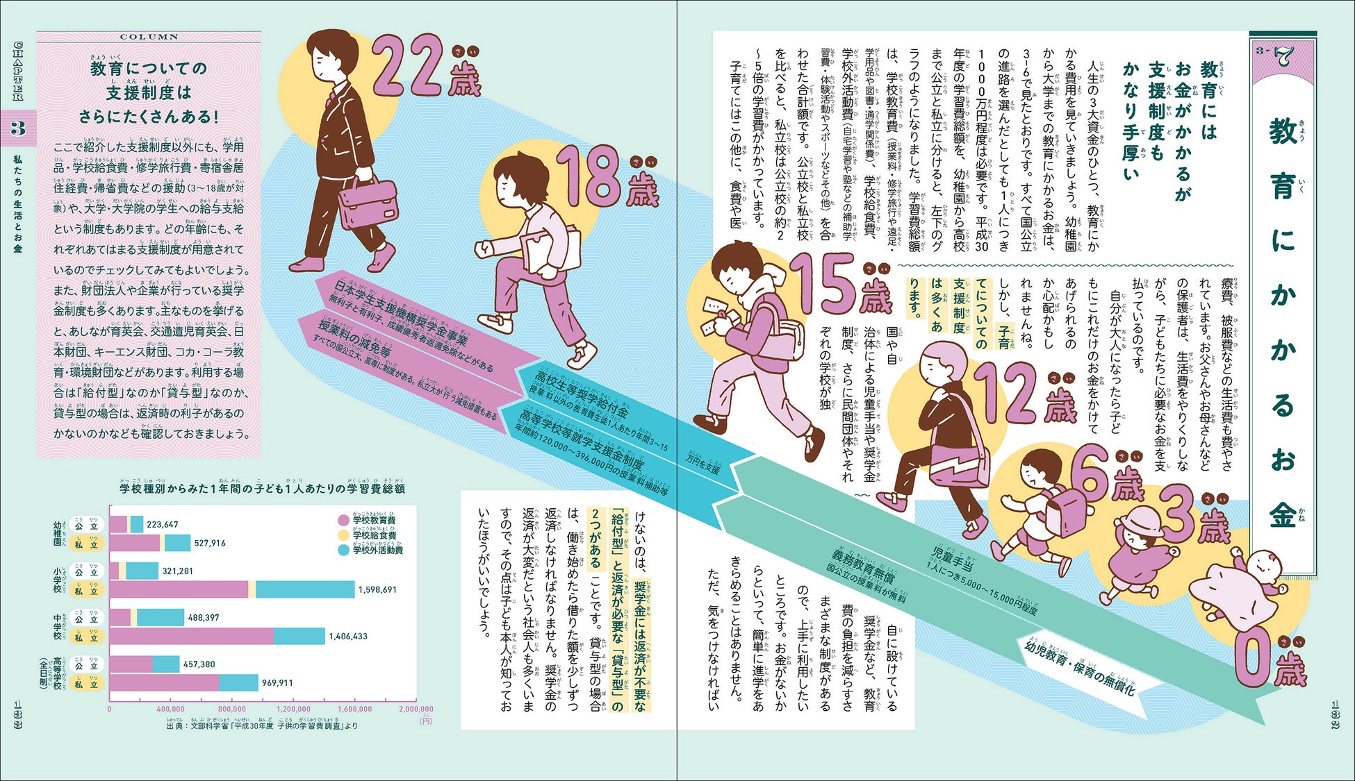 渡辺:『お金と生き方の教室』でも、教育にかかるお金や支援制度について解説しているページがありましたね。奨学金には返済が不要な「給与型」と、返済が必要な「貸与型」があることなども含めて、親子で学んで考えるきっかけにしてもらいたいです。知ることが大事です。用意されている支援がありますから。