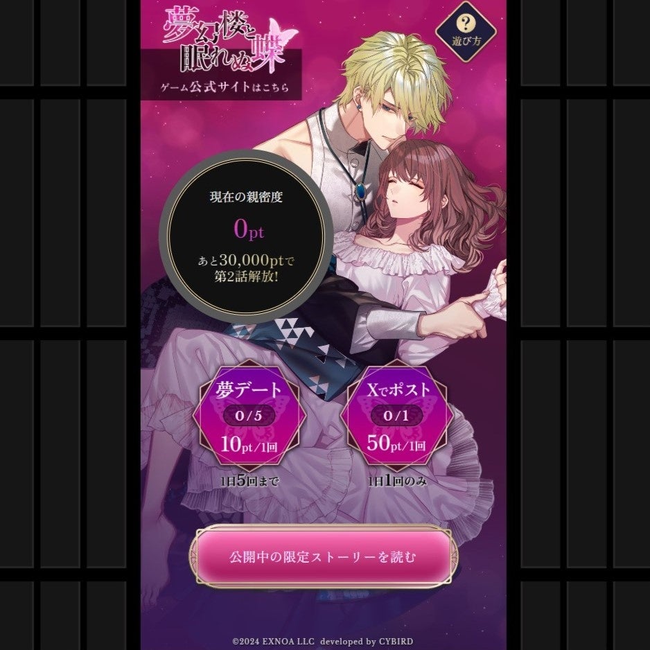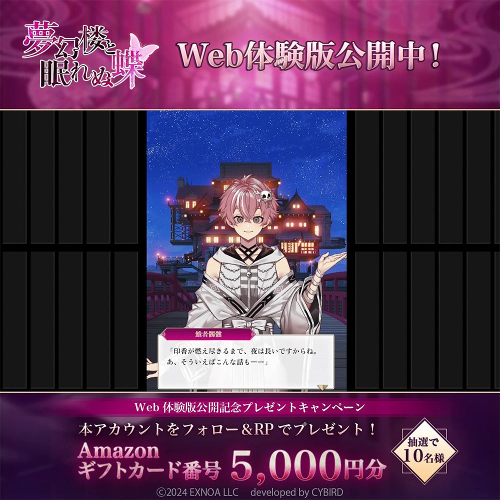 DMM GAMESを運営する合同会社EXNOA(本社:東京都港区、CEO:村中 悠介、URL:https://games.dmm.com/)は、オトナの女性向け恋愛ゲーム「夢幻楼と眠れぬ蝶」の公式サイトにて、オリジナルのミニストーリーが楽しめるWeb体験版を公開いたしました。また、体験版の公開を記念して「夢幻楼と眠れぬ蝶」の公式Xにてリポストキャンペーンを開催いたします。