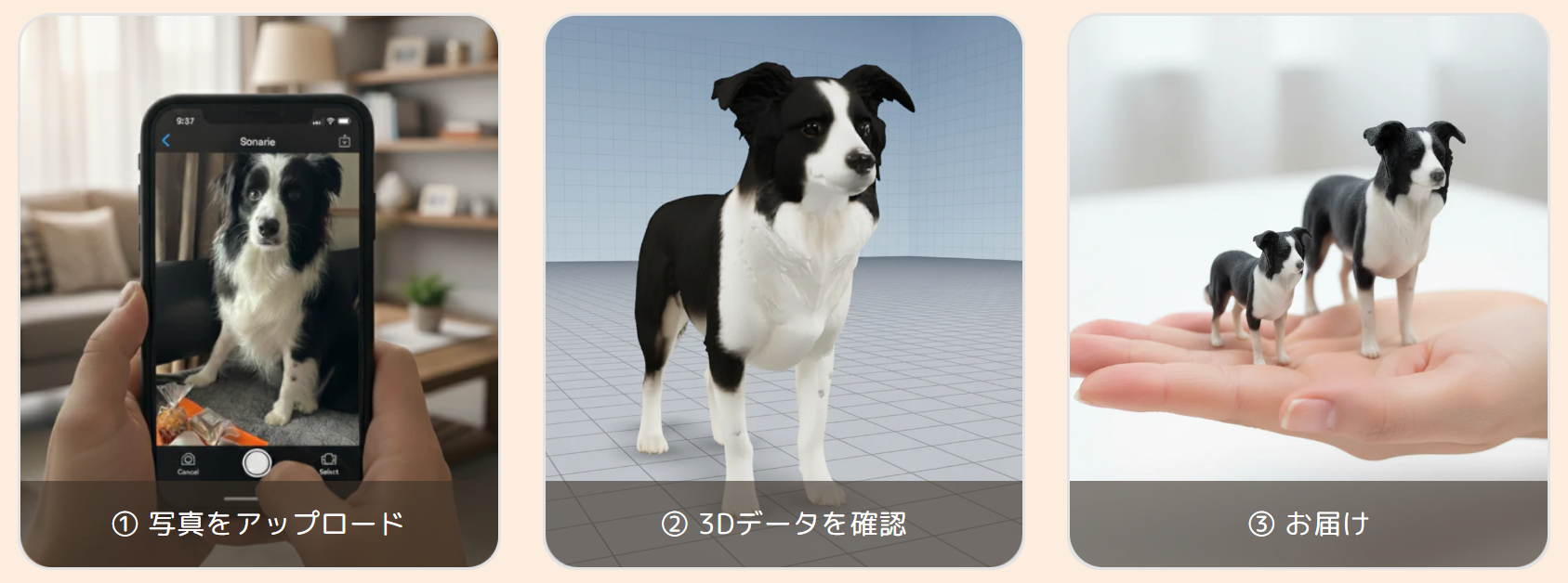 ①写真1枚で、手のひらサイズの立体的なペットフィギュアがつくれる!