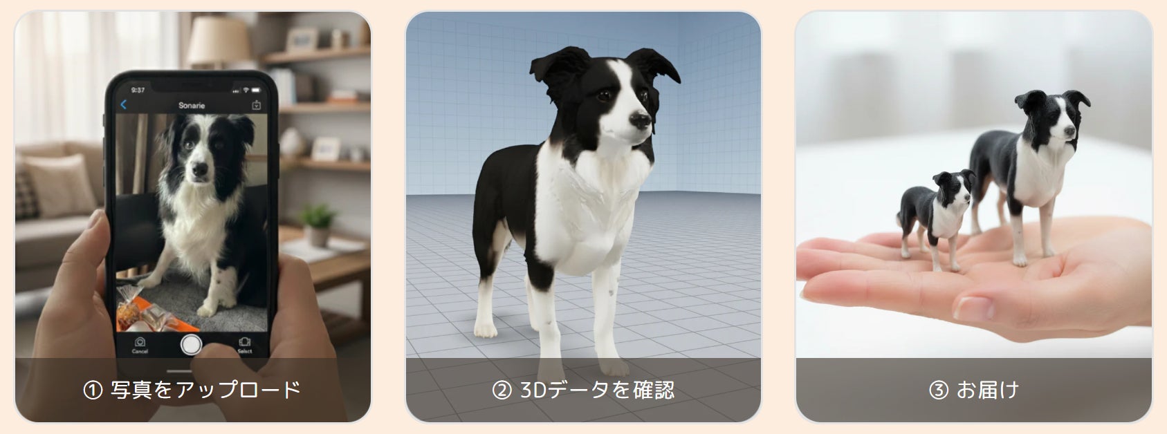 ご自身のスマートフォンなどで撮影したペットの写真を1枚アップロードするだけで、手のひらサイズの、フルカラー3Dフィギュアを作成することができます。