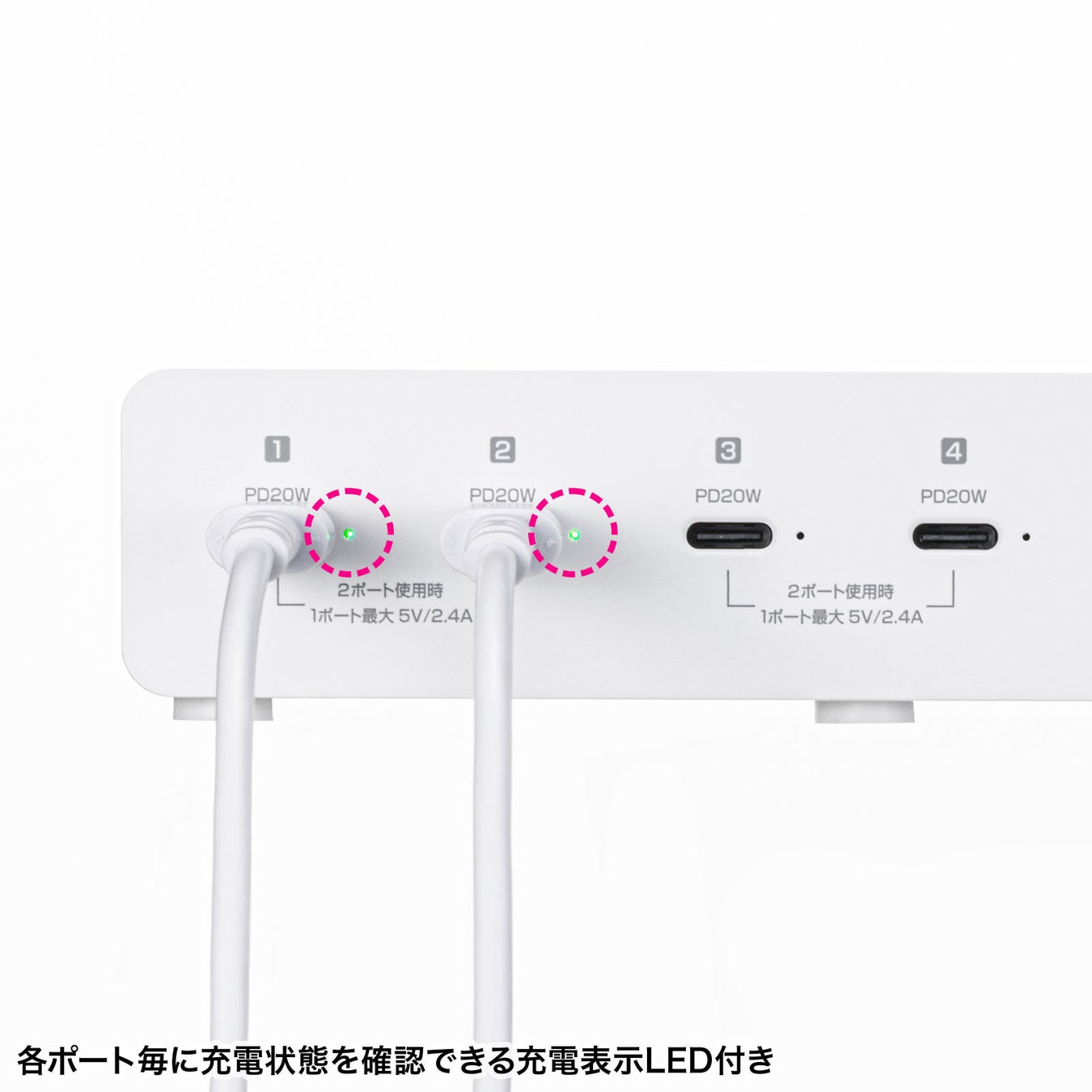 各ポートごとに充電状態が確認できる充電表示LED付きです。