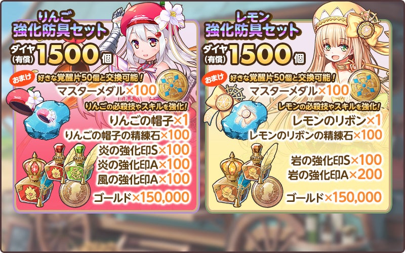 Sりんご【創生樹の御使い】とSレモン【怖がりだけどぱぱのためなら】の強化防具セットの販売を開始致しました。新しく手に入れた限定コラボキャラの強化に是非お役立て下さい!