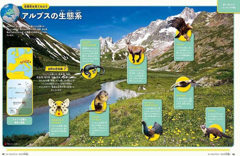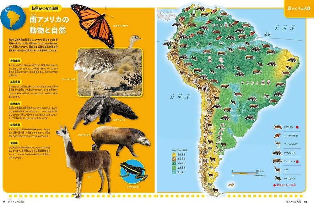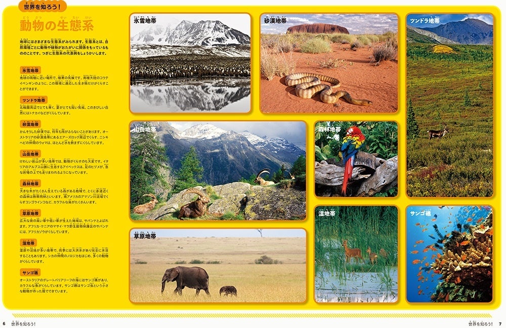 海や山脈、砂漠など、大陸ごとの地形や自然環境を学びながら、そこに生息している動物と生態系を解説しています。