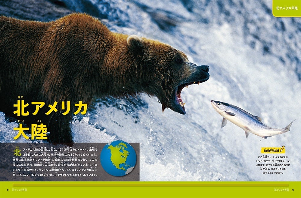 本書は、北アメリカ大陸、南アメリカ大陸、ヨーロッパ(ユーラシア大陸)、アジア(ユーラシア大陸)、アフリカ大陸、オーストラリア大陸、南極大陸の7つに区分し、それぞれの地域に生息している生き物を紹介。