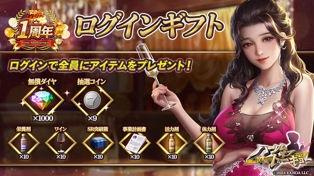 合同会社EXNOA(本社:東京都港区、CEO:村中 悠介、URL:https://games.dmm.com/)は、アウトローハーレム系経営RPG『ハーレムオブトーキョー』にて、2024年9月20日(金)より1周年キャンペーンを実施する事をお知らせいたします。