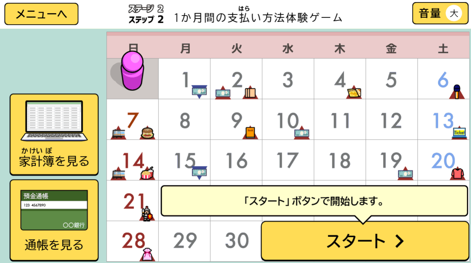 キャッシュレス決済での買い物や、1か月の金銭管理が疑似体験できます。