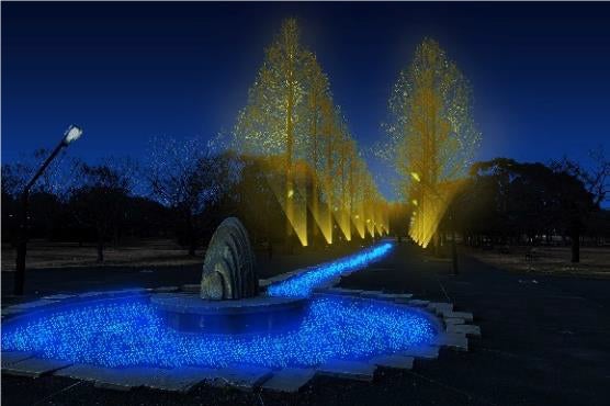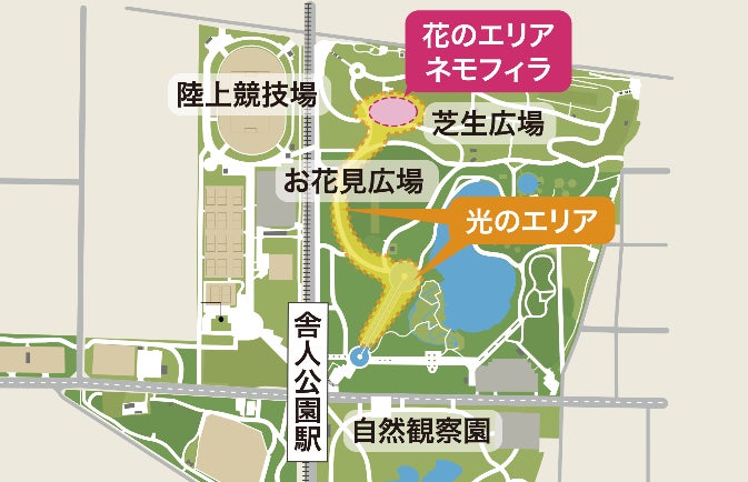 都立公園では、新たな魅力ある大規模花壇を創出し、四季を通じた花と光の演出によって公園の新しい楽しみ方をお届けする「花と光のムーブメント」を実施しており、舎人公園では、昨年に引き続き今年もネモフィラ花壇の創出と、夜のライトアップを行います。