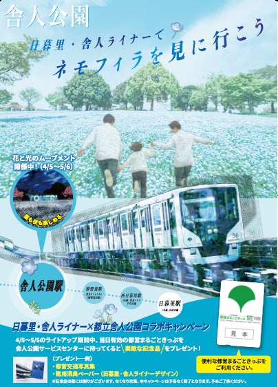 東京都交通局(東京都新宿区西新宿2-8-1、交通局長:久我英男)と公益財団法人東京都公園協会(東京都新宿区歌舞伎町2-44-1、理事長:矢岡俊樹)は、東京都公園協会主催の「花と光のムーブメント舎人公園×ネモフィラ」開催にあわせ、「日暮里・舎人ライナー×都立舎人公園コラボキャンペーン」を実施します。