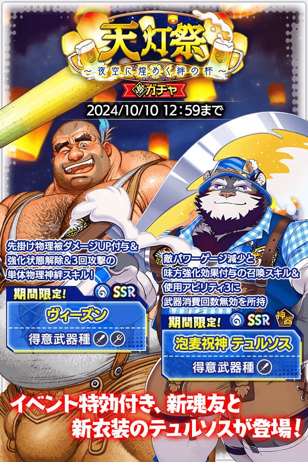 さらに、SSR魂友「ヴィ―ズン」とSSR神器「泡麦祝神 テュルソス」が入手可能な期間限定の「天灯祭~夜空に煌めく絆の杯~」ガチャも登場!