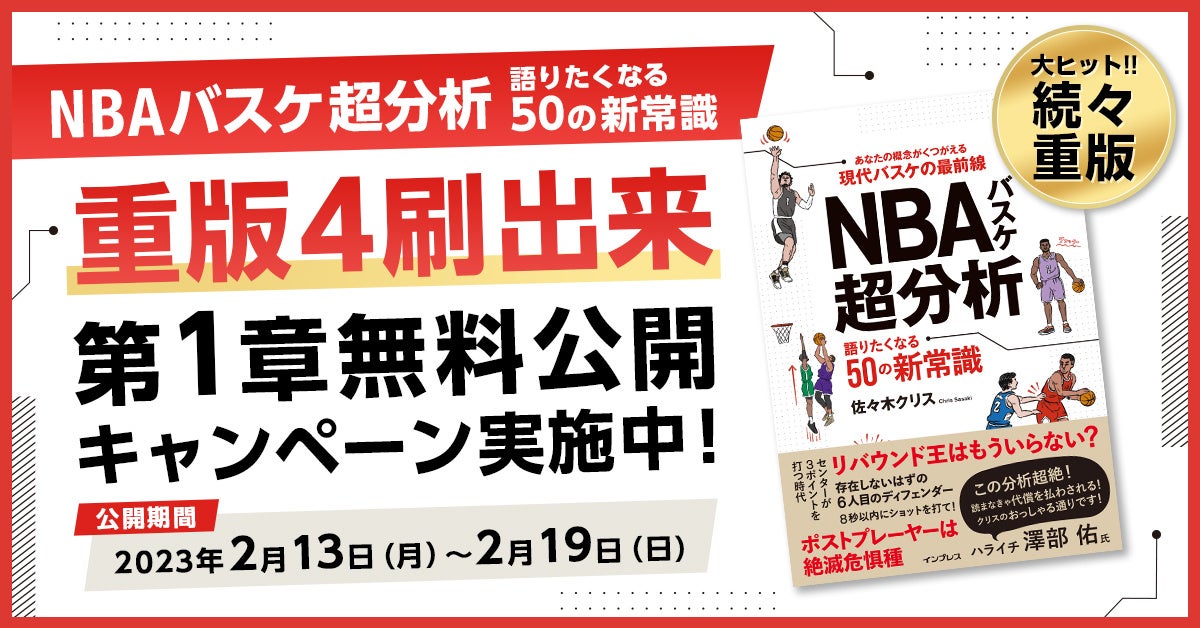 インプレスグループでIT関連メディア事業を展開する株式会社インプレス(本社:東京都千代田区、代表取締役社長:小川 亨)は、書籍『NBAバスケ超分析 語りたくなる50の新常識』の重版出来を記念して、2023年2月13日(月)~2023年2月19日(日)の間、本書の第1章を無料公開するキャンペーンを実施します。
