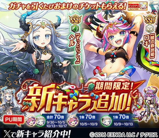 合同会社EXNOA(本社:東京都港区、CEO:村中 悠介、URL:https://games.dmm.com/)が運営するDMM GAMESにおいて『神姫PROJECT』は、「ロキ」「ヘル」が新たな神姫として初登場する事を発表した。さらに毎日最高100連のルーレットガチャの開催や、9月30日よりプレミアムパスの特典が更新される。