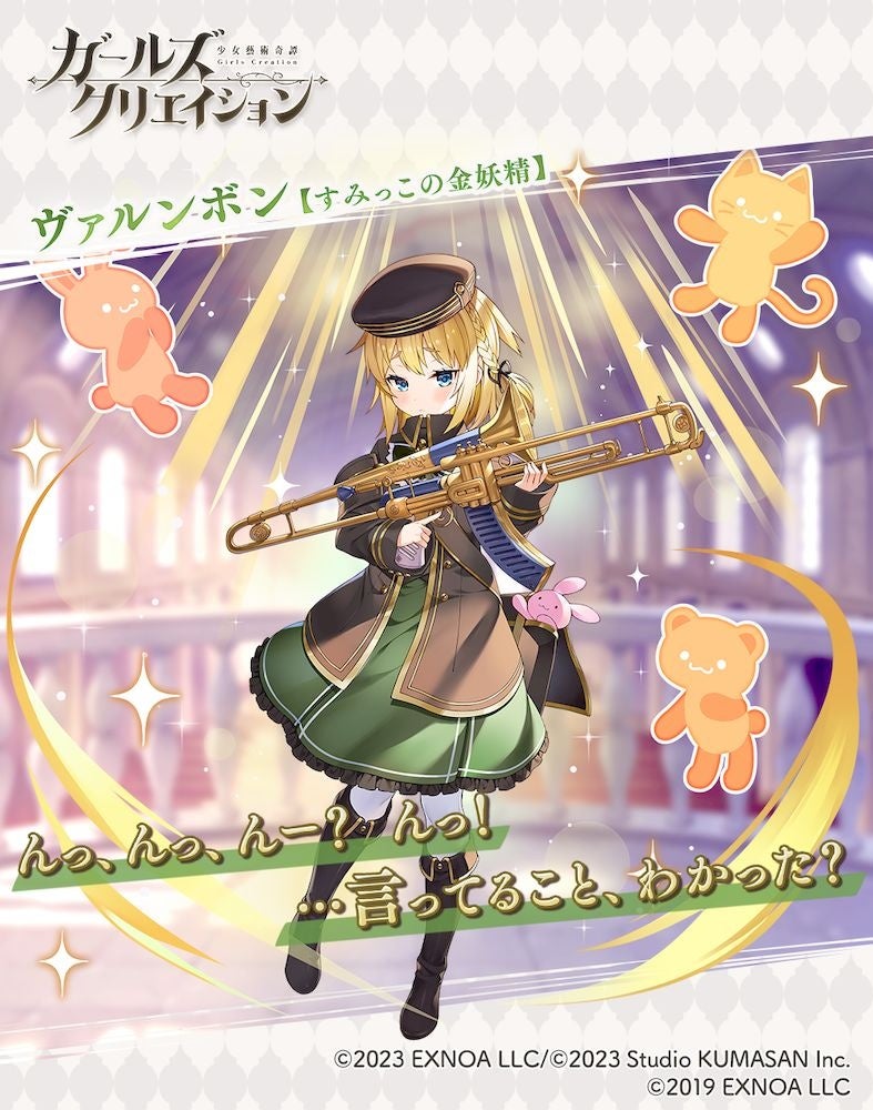 合同会社EXNOA(本社:東京都港区、CEO:村中 悠介、URL:https://games.dmm.com/)が運営するDMM GAMESにおいて、「クリエイティブチーム くまさん」第4弾作品となる『ガールズクリエイション -少女藝術綺譚-』(以下、『ガールズクリエイション』)にて、『ガールズシンフォニー:Ec 〜新世界少女組曲〜』とのコラボイベント「繋がる芸術の輪舞」の開催と、マティア★5スタイル【覚悟のバイオリン】とヴァルンボン★5スタイル【すみっこの金妖精】の登場をお知らせいたします。