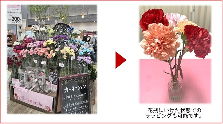 本年の「母の日フラワーギフト」は、従来の鉢植えはもちろん、バルーンやピックに感謝の気持ちを込めた母の日アレンジギフト、カラフルでバリエーション豊かな最大20品種のカーネーションからオリジナルブーケを作成できる“カーネーションマルシェ企画”のものも。また、亡くなったお母さまをしのんでお供えする“母の日参りブーケ”など、大切な方への贈り物に最適な商品を豊富にご用意します。また、ゴールデンウィーク期間には、親子でアレンジづくりが楽しめる“母の日親子ワークショップ”を開催します。