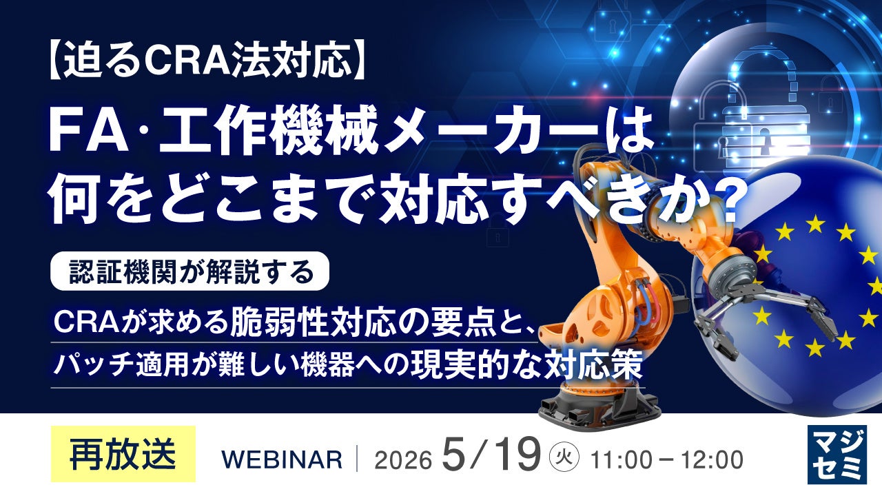 マジセミ株式会社は、大変好評をいただいた「【再放送】<迫るCRA法対応>FA・工作機械メーカーは何をどこまで対応すべきか?」というテーマのウェビナーを再放送します。