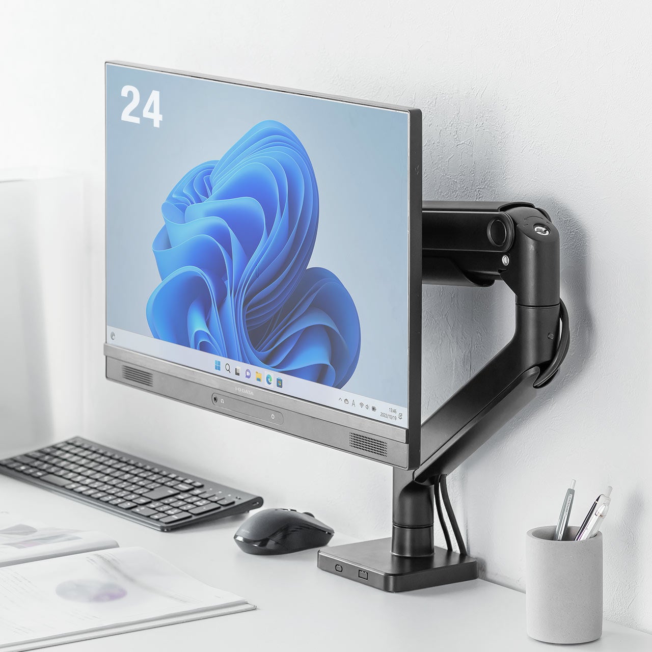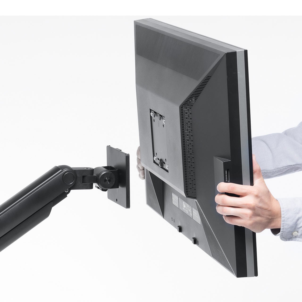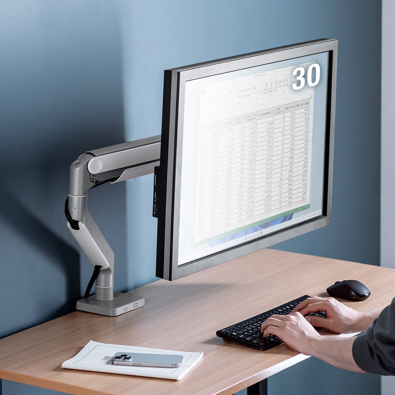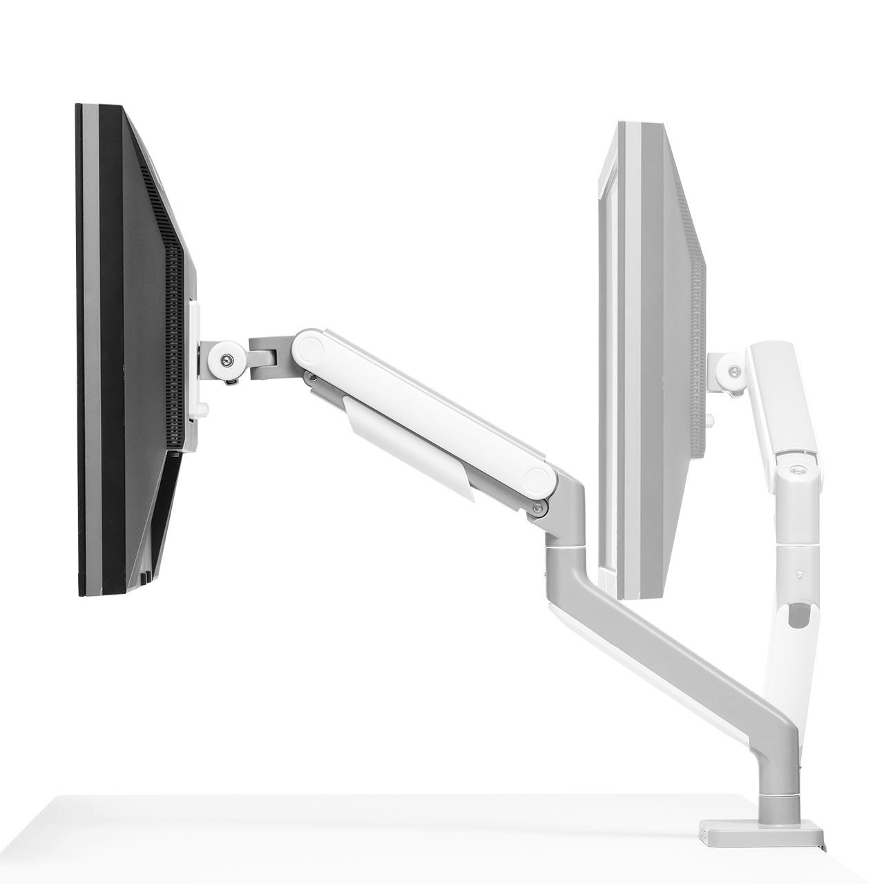 水平空間に対して大きく伸縮する3関節のモニタアームで、奥行きの広いデスクなどでの使用に最適です。