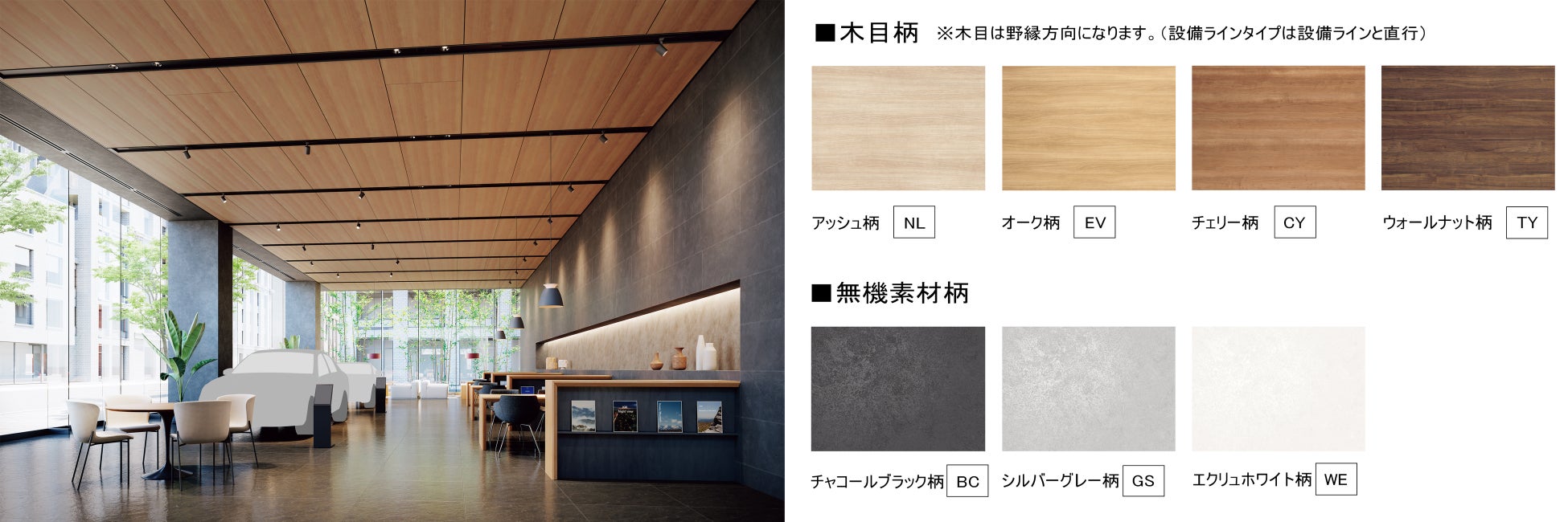 「エアリライト」は新開発の異素材複層成形技術で、ガラス繊維シートとアルミ箔をラミネートした表層材と軽量素材の発泡ウレタン樹脂をコア材とした天井質量2 kg/平米以下を実現した不燃軽量天井材です。設計性、施工性に優れた従来からの特長に加えて、2022年10月には設備機器を組み込むライン状の部位とパネル部位を組み合わせた「設備ラインタイプ」を追加。天井パネルには、要望の多かった木目柄を4柄と無機素材柄3柄を追加ラインアップ。また現場塗装仕上げが可能な専用の不燃塗料(標準色36色、特注では420色)を用意。これまでよりも空間の意匠性を高める提案ができるようになりました。