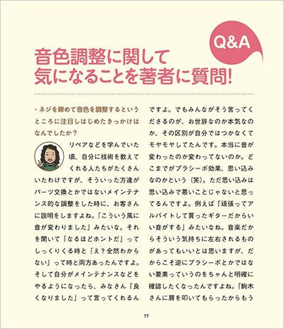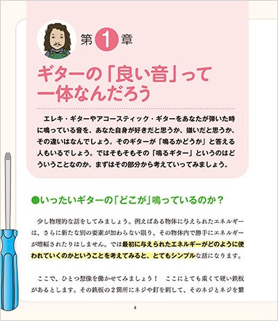そのためギターの音色ではなくギターの演奏性や音程感を向上させる目的の一般的なメインテナンスやノウハウ(ネックの反りやオクターブ調整など)は本書の対象外ですが、ドライバーを使用した著者の技法と音色変化の関係性などを学んだ結果、自分のギターを自分の好みの音色にチューンナップできるようになっていきます。