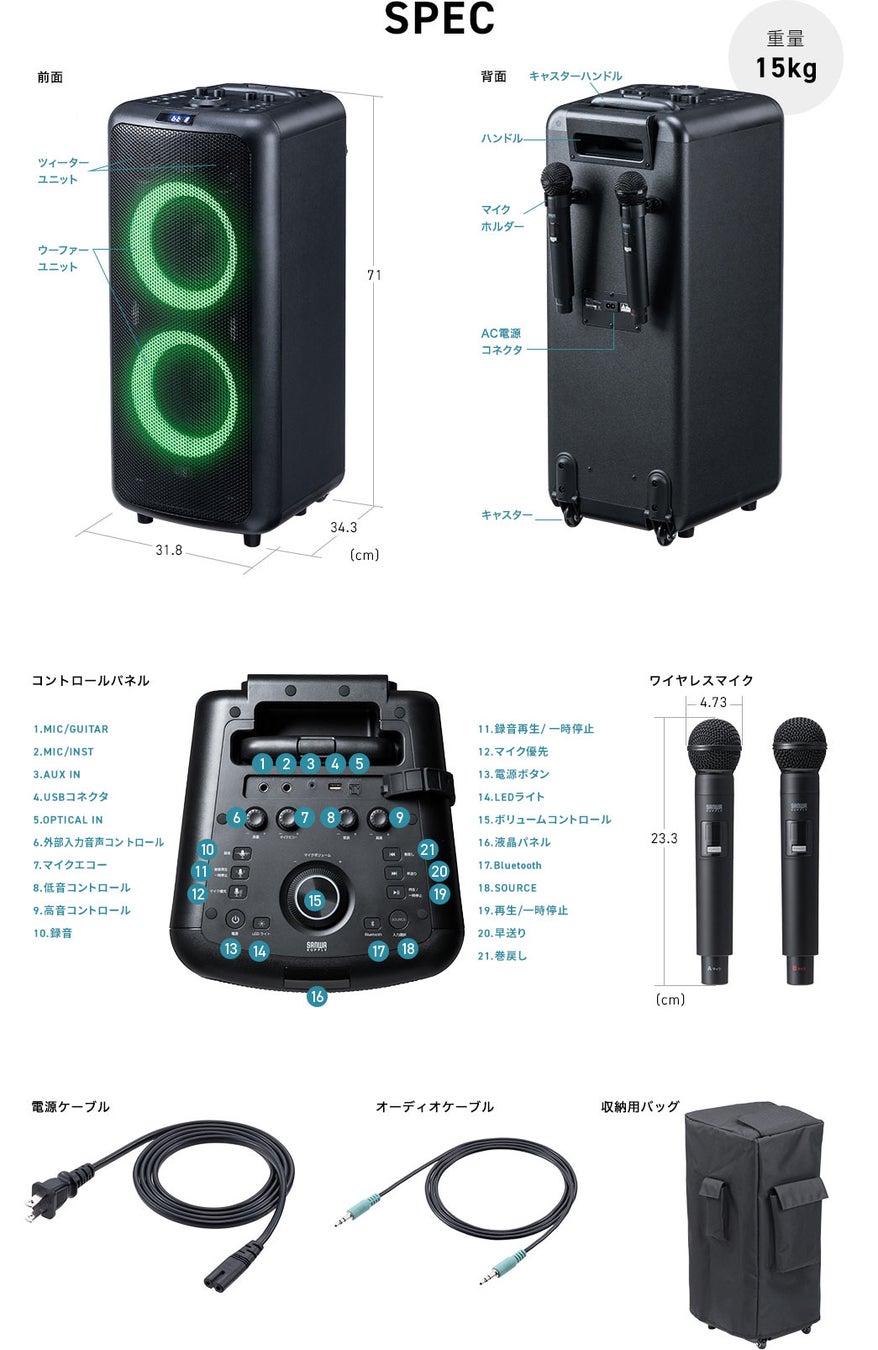 イベントスピーカー 拡声器 ワイヤレスマイク 2本付属 最大180W LED搭載 収納バッグ付き