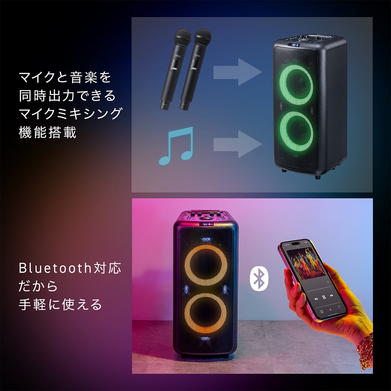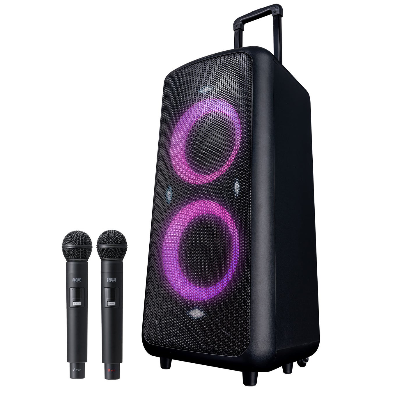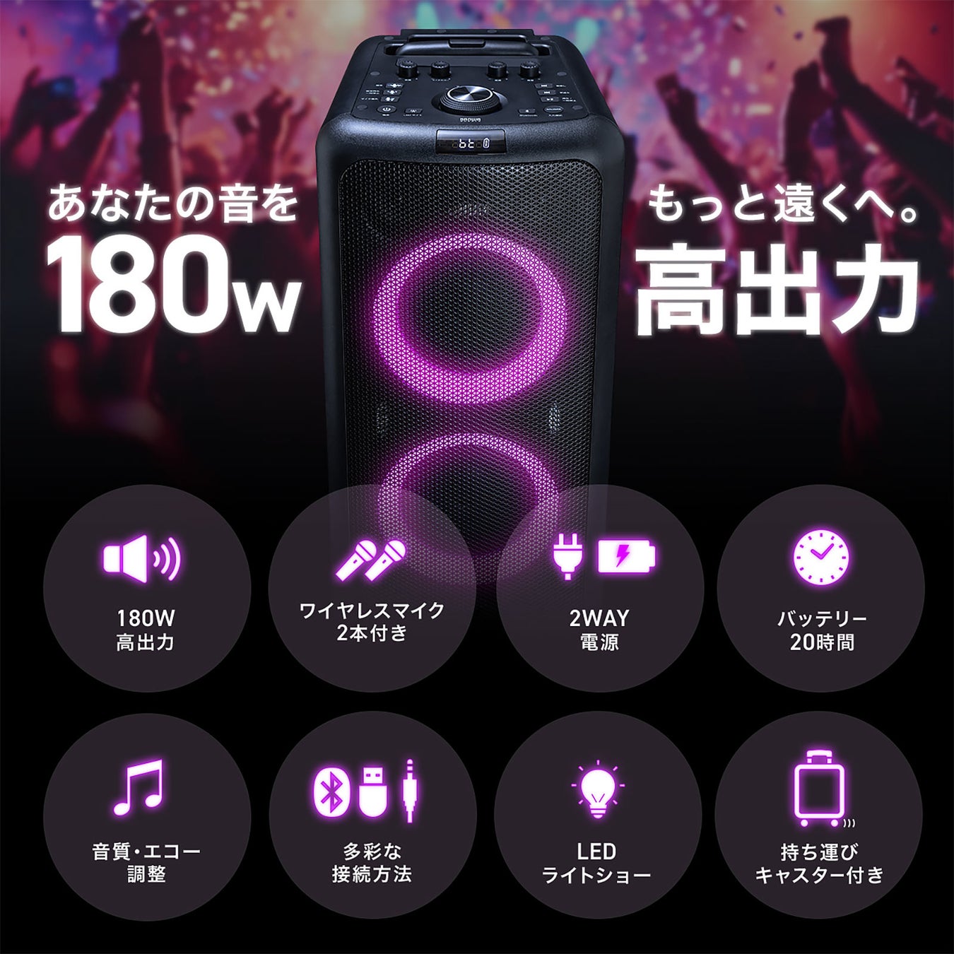 最大180W出力可能で、音に合わせて光るLEDライトショーモード搭載、ワイヤレスマイクも2本付属した、バッテリー駆動もできる拡声器
