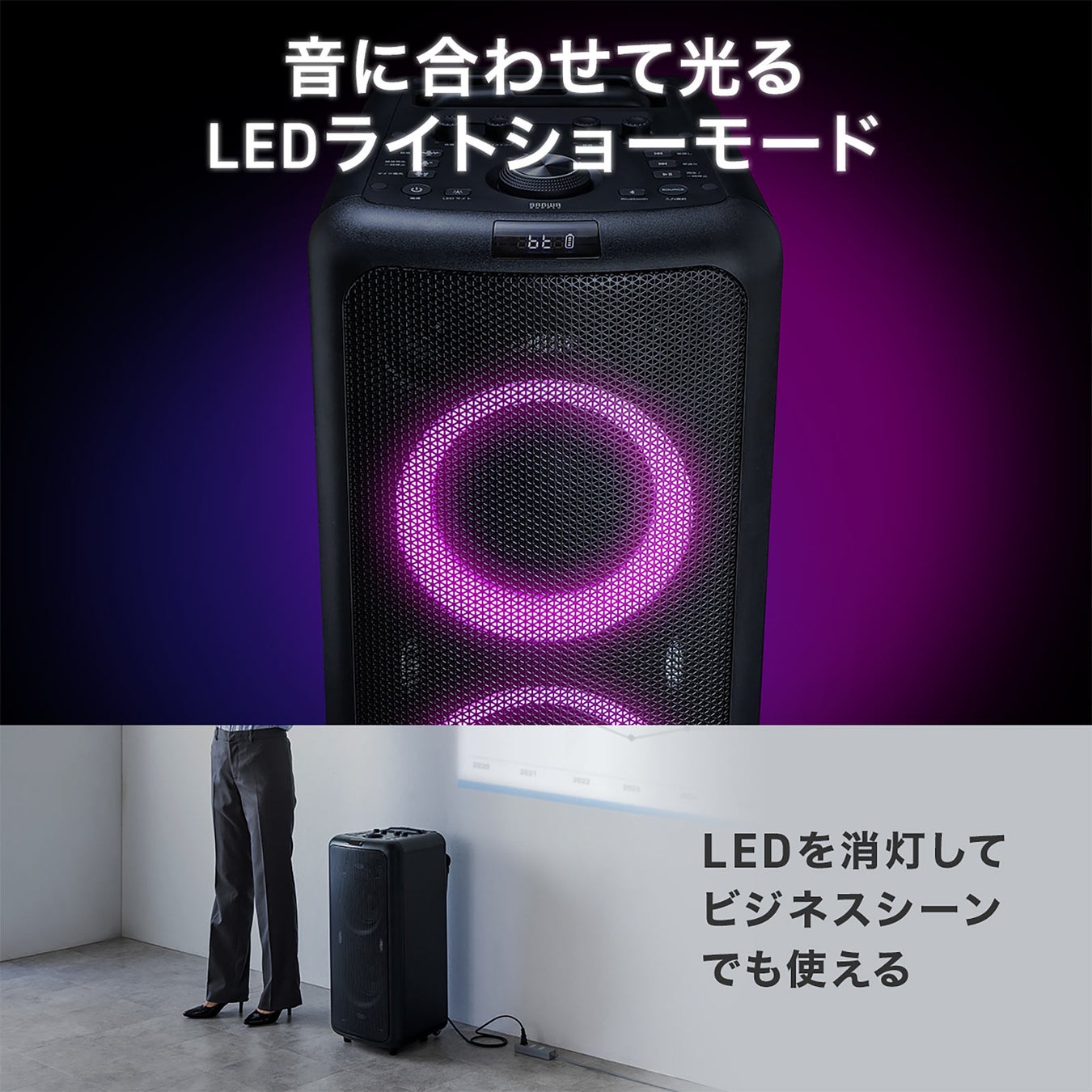 ・音に合わせてLEDが光るライトショーモード搭載でパーティやイベントにも最適