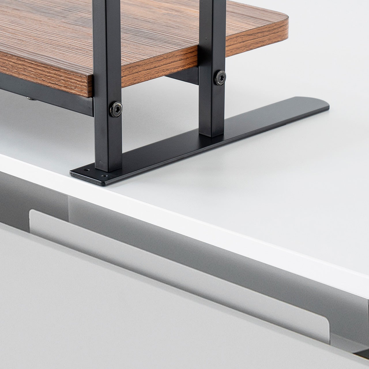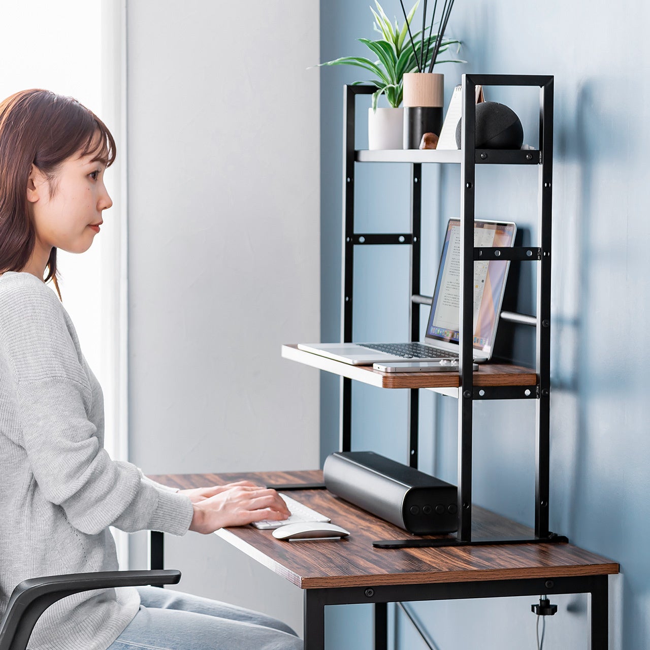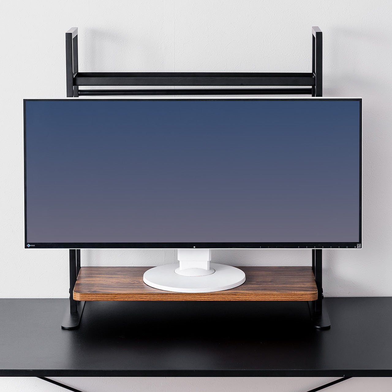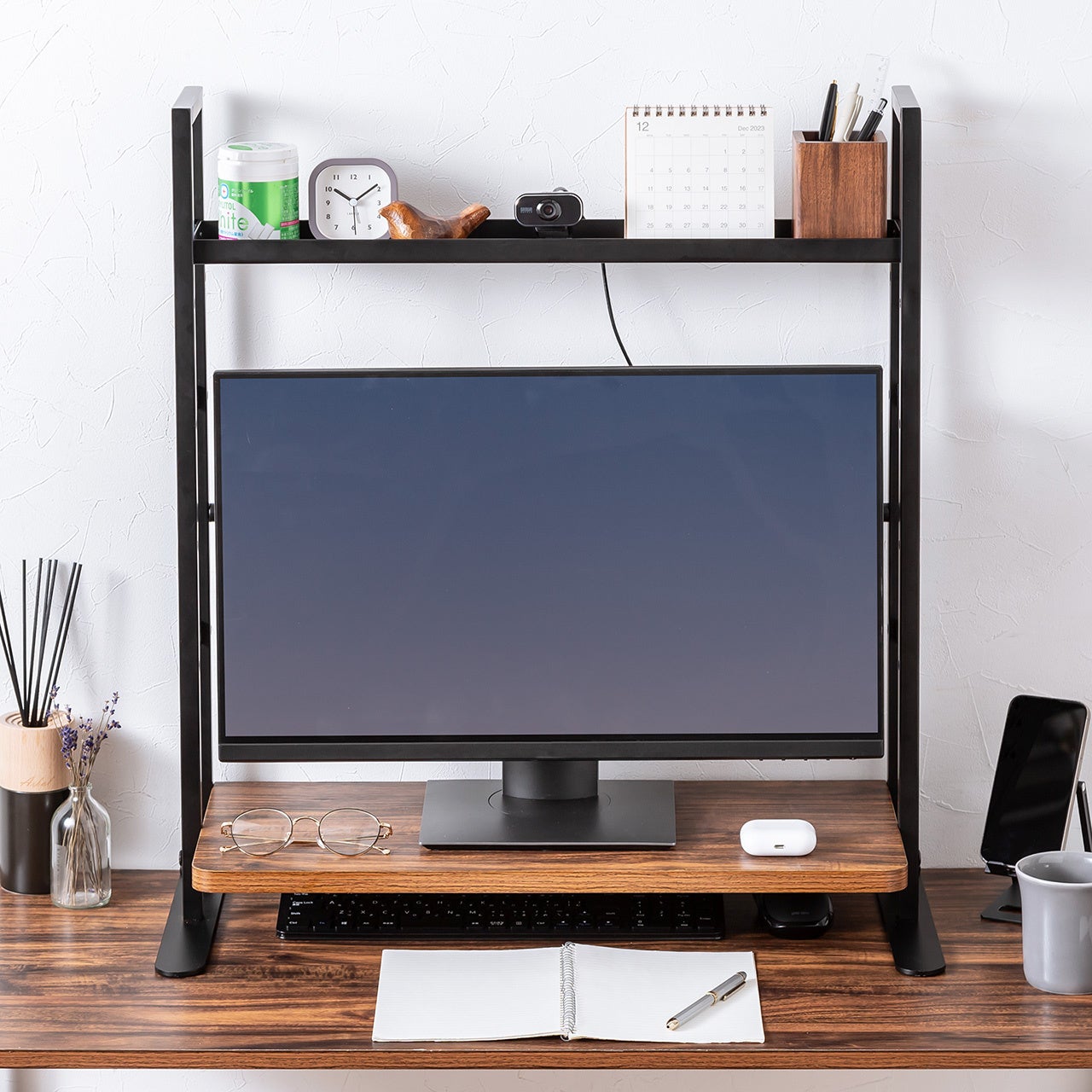 棚板とトレーはそれぞれ約10kgの耐荷重を備え、モニターだけでなくノートパソコンや周辺機器も安定して支えます。