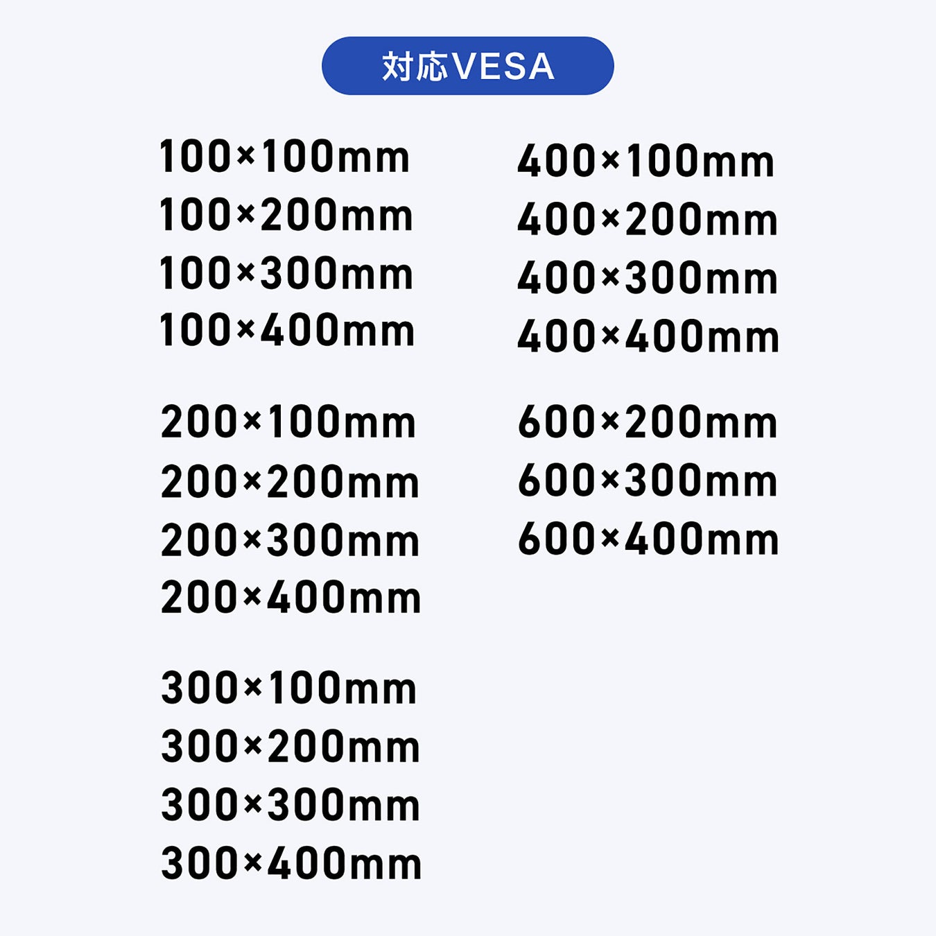 100×100から600×400まで、幅広いVESA規格に対応しています。さまざまなメーカーや型番のテレビやモニターを取り付けられるため、将来的な機器の更新にも柔軟に対応可能です。