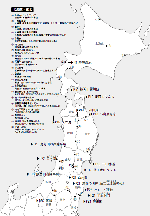 静狩湿原/建有川寨門跡/青函トンネル/小舟渡海岸/十和田湖/久六島/二口林道/蔵王登山リフト/飯豊山盲腸県境/鳥海山の直線県境/白河関と追分の明神/鼠ヶ関/勿来関、平潟洞門、アメーバ県境/尾瀬