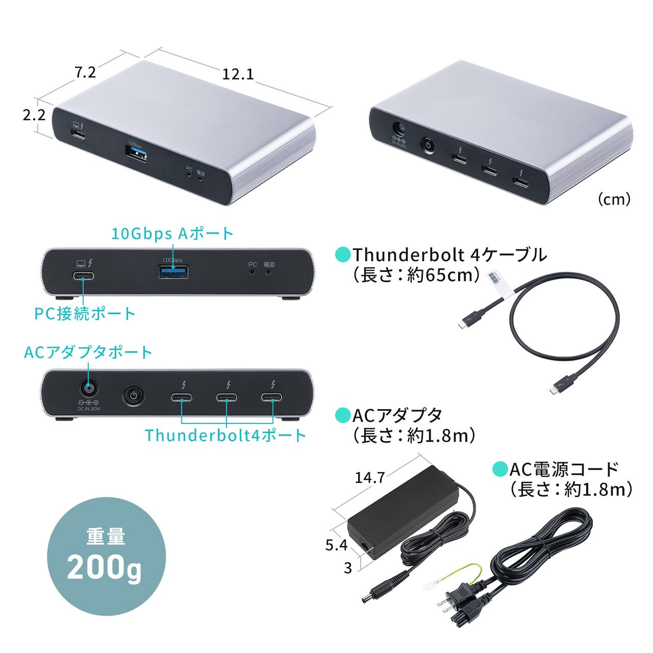 本製品のサイズはW12.1×D7.2×H2.2cm、 重量は200gです。