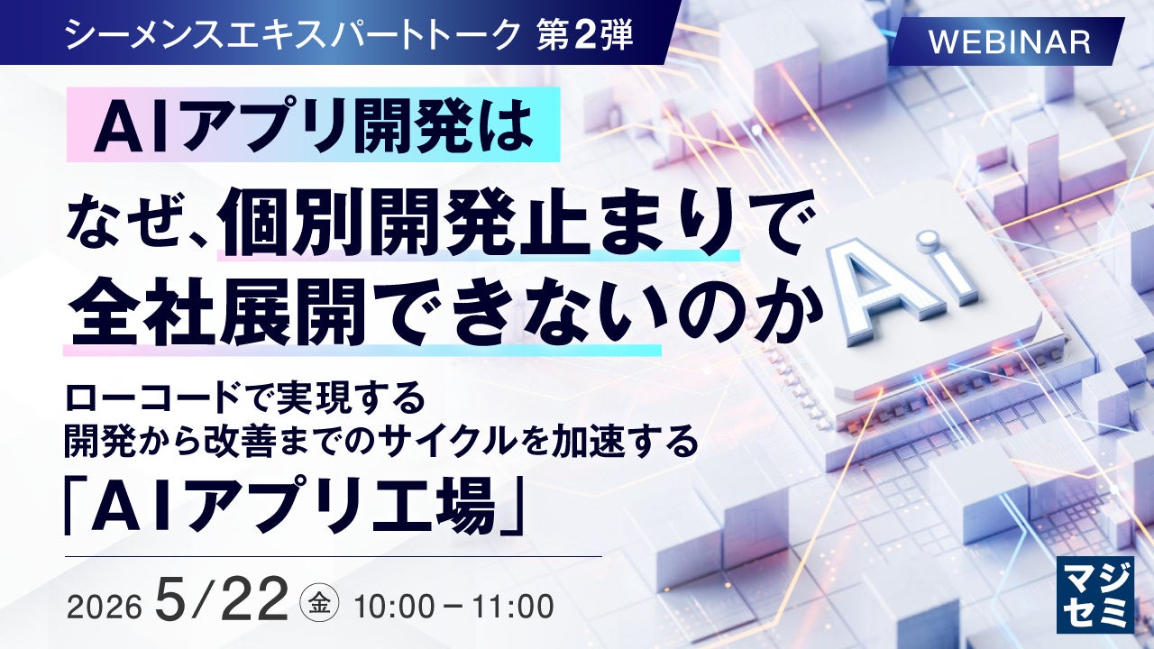 マジセミ株式会社は「【シーメンスエキスパートトーク 第2弾】AIアプリ開発はなぜ、個別開発止まりで全社展開できないのか」というテーマのウェビナーを開催します。