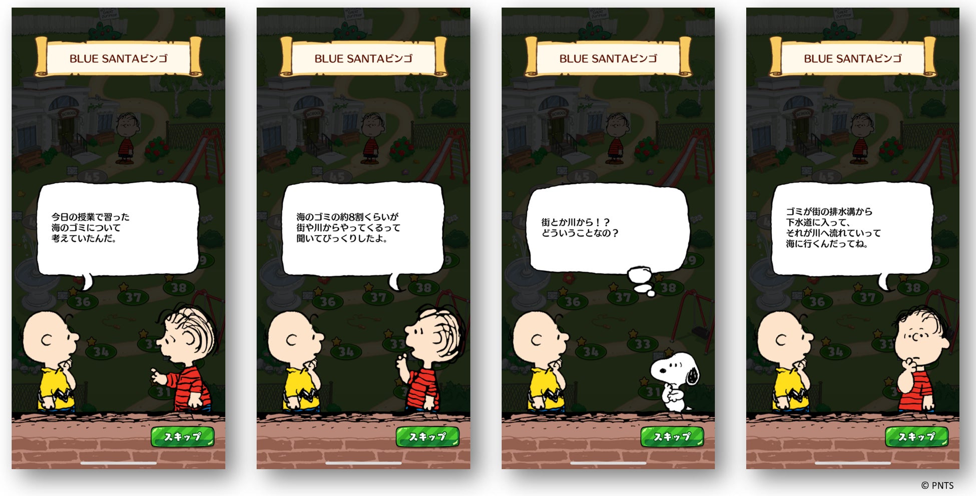 コラボイベントでは、PEANUTSに登場するキャラクターたちが、海のゴミ問題やゴミ拾いイベントに参加する様子などを描いたオリジナルストーリーが楽しめます。