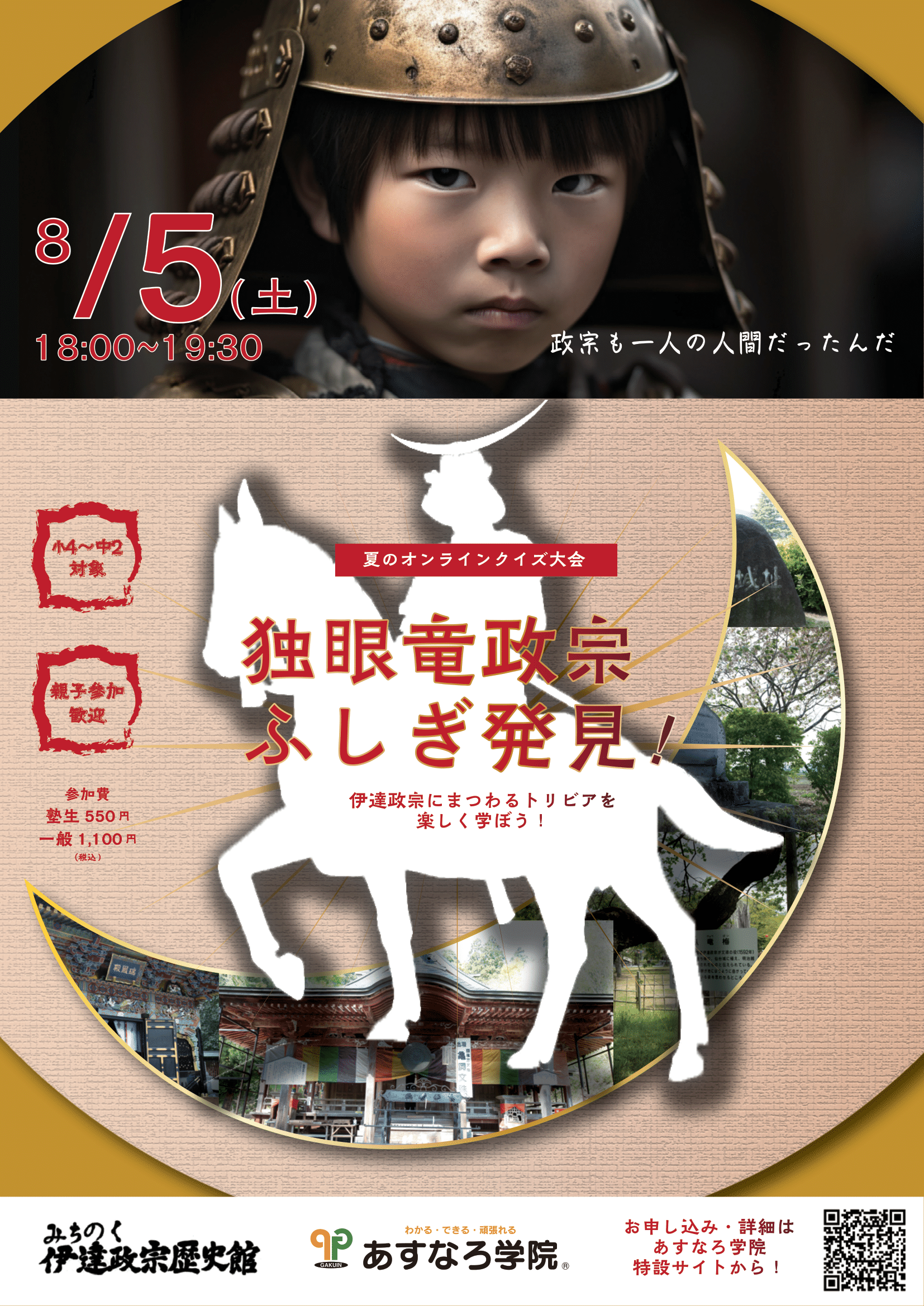 【宮城県のあすなろ学院×みちのく伊達政宗歴史館】夏のオンラインクイズ大会「独眼竜政宗ふしぎ発見!」8/5開催