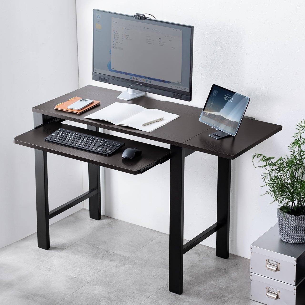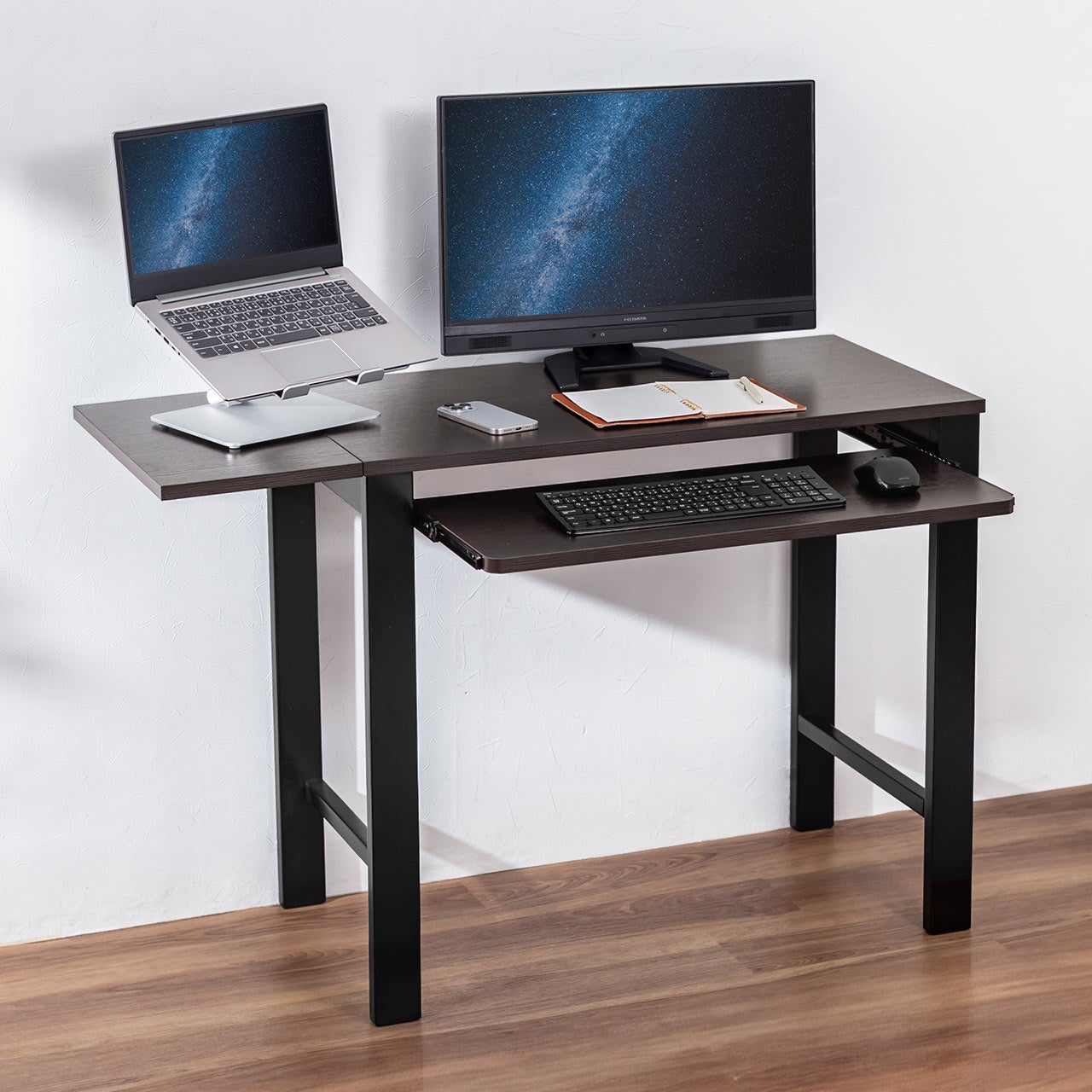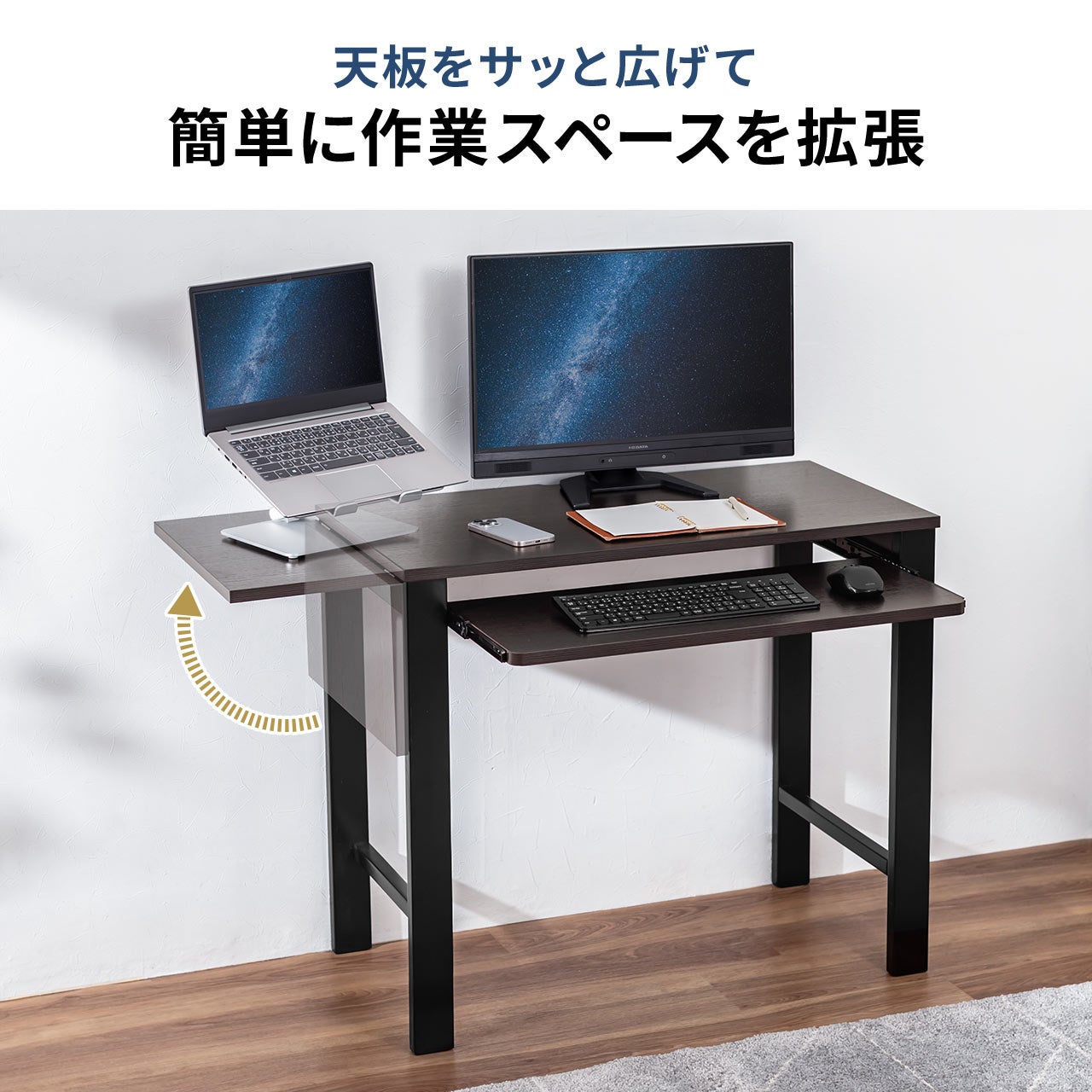 ・幅85cmから110cmに拡張可能で、狭い場所でも机を広く使える