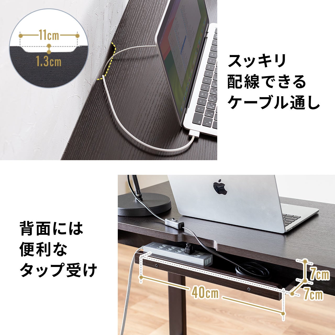 天板にはケーブルを通す穴が設けられ、背面にはタップ受けも付いています。これにより、煩雑になりがちな配線をすっきりと整理できます。作業環境を綺麗に保つことができます。快適な作業スペースを提供します。